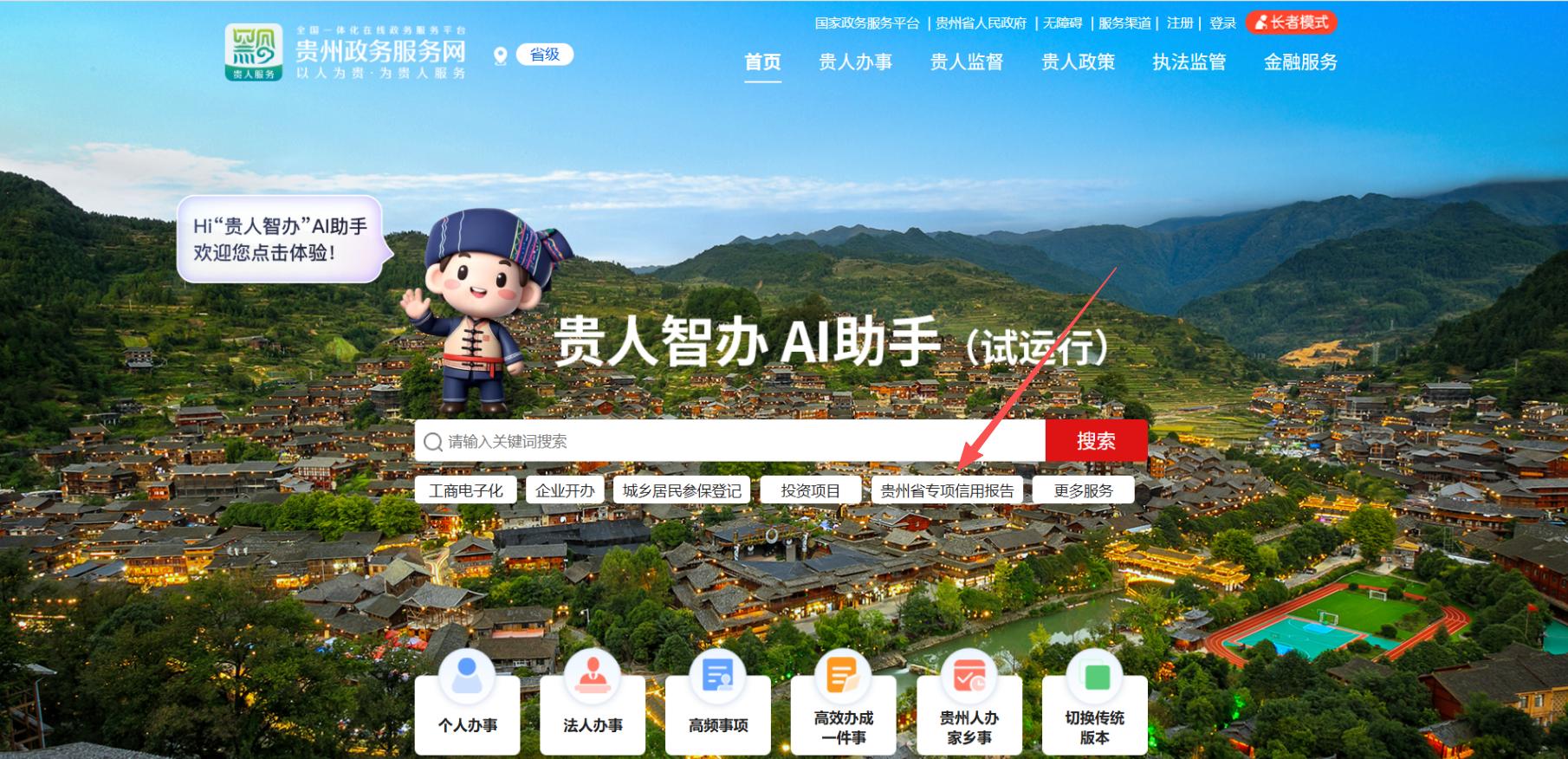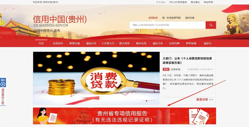 (1)查询入口:信用主体可通过电脑浏览器访问“信用中国(贵州)”网站(图1)、贵州政务服务网(图2)、省公共资源交易平台(图3)“贵州省专项信用报告”查询入口进入专栏。