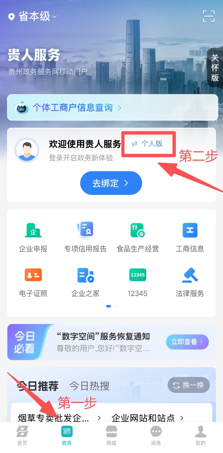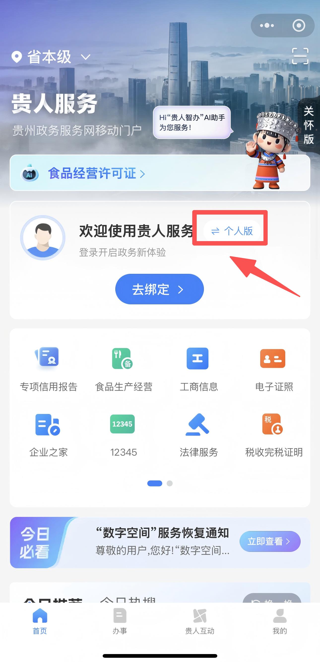 (1)统一实名认证入口:信用主体进入“贵人服务”微信、支付宝小程序(图13)和“多彩宝”APP政务专版(图14)首页后,将版本切换至“法人版”(即图标显示为“个人版”时,说明当前版本已完成切换)。