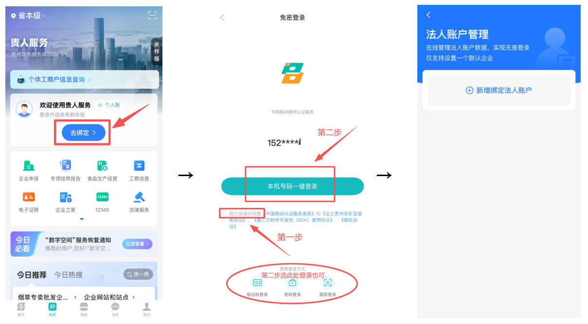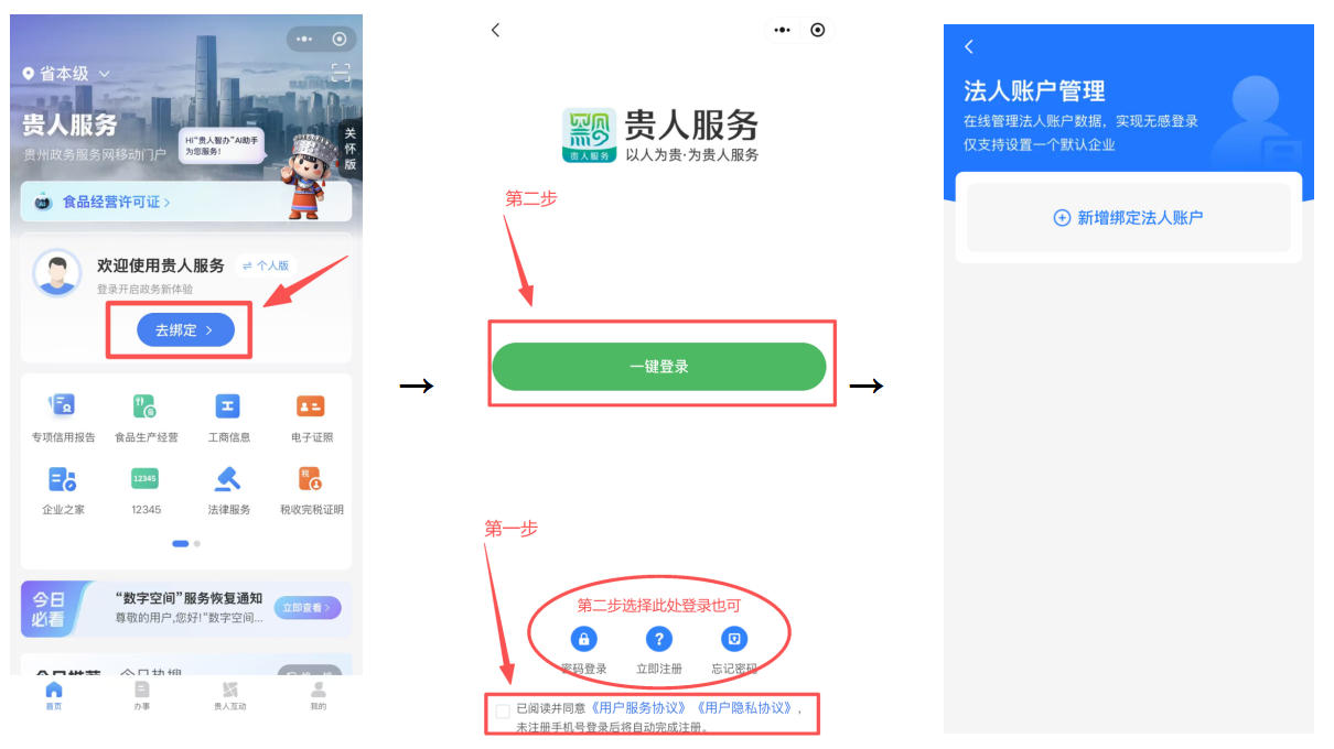 (2)绑定账户:点击“去绑定”后,若出现初始登录页面,则勾选“已阅读并同意”完成“一键登录”后将跳转至“新增绑定法人账户”页面。(延续上一步骤,图15和图16分别对应“贵人服务”微信、支付宝小程序和“多彩宝”APP政务专版)