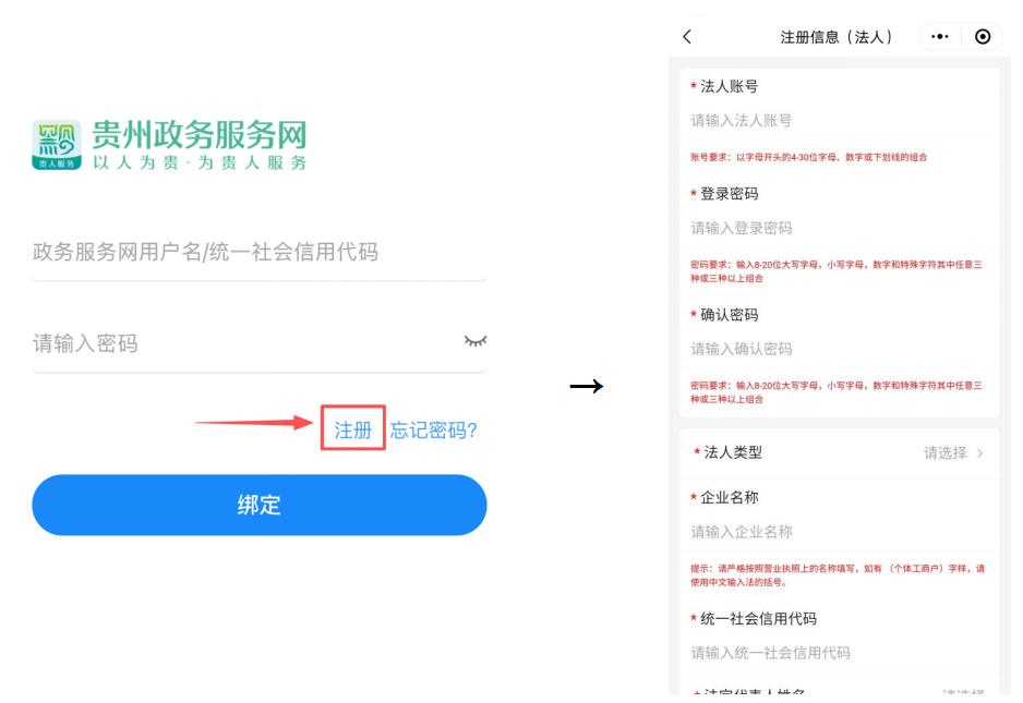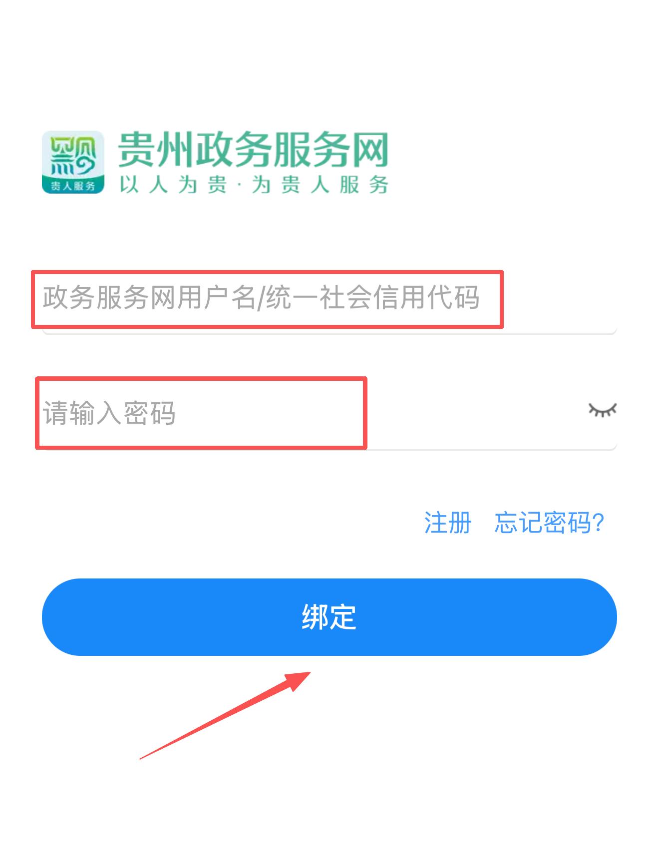 若点击“去绑定”后直接跳转至“新增绑定法人账户”页面,如有“贵州省统一实名认证系统”法人账号,则直接输入正确的账号密码后点击绑定(图17);如无“贵州省统一实名认证系统”法人账号,则点击“注册”,按照提示注册法人账号完成绑定(图18)。