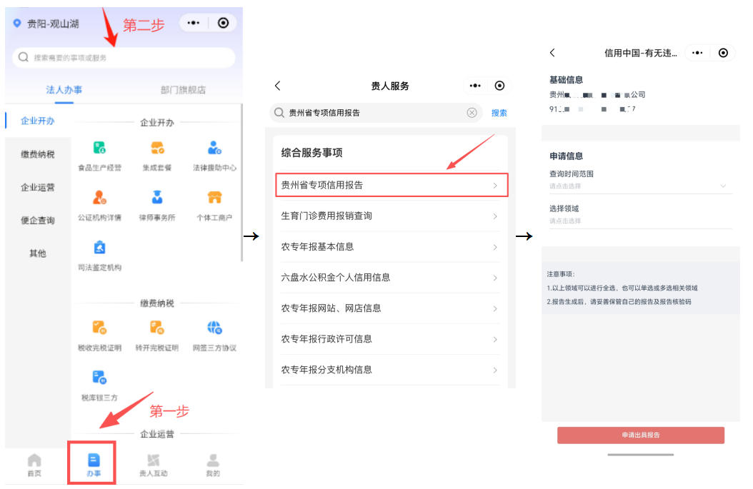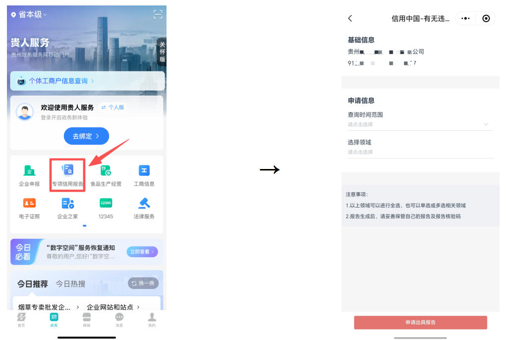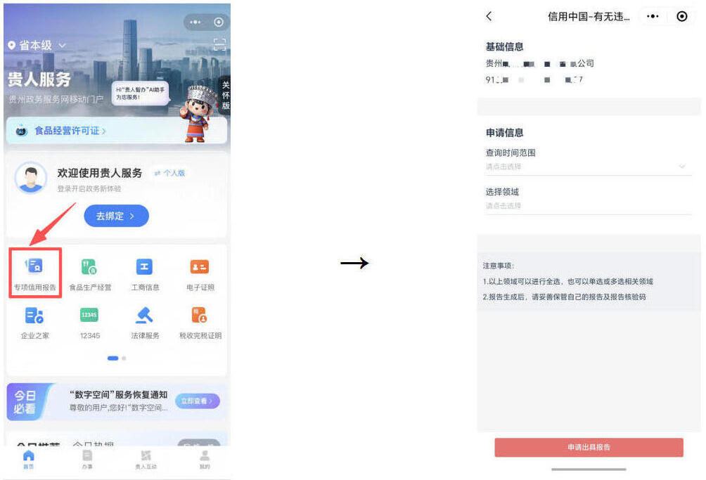 2.移动端:信用主体进入“贵人服务”微信、支付宝小程序首页和“多彩宝”APP政务专版完成法人账户绑定后,通过“贵州省专项信用报告”查询入口,根据不同应用场景需要,自主选择相应时段、对应领域进行申请,免费下载自身专项信用报告。