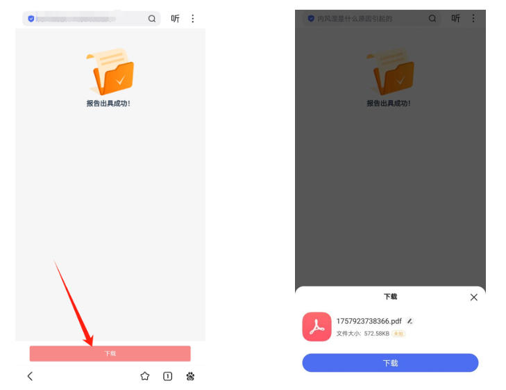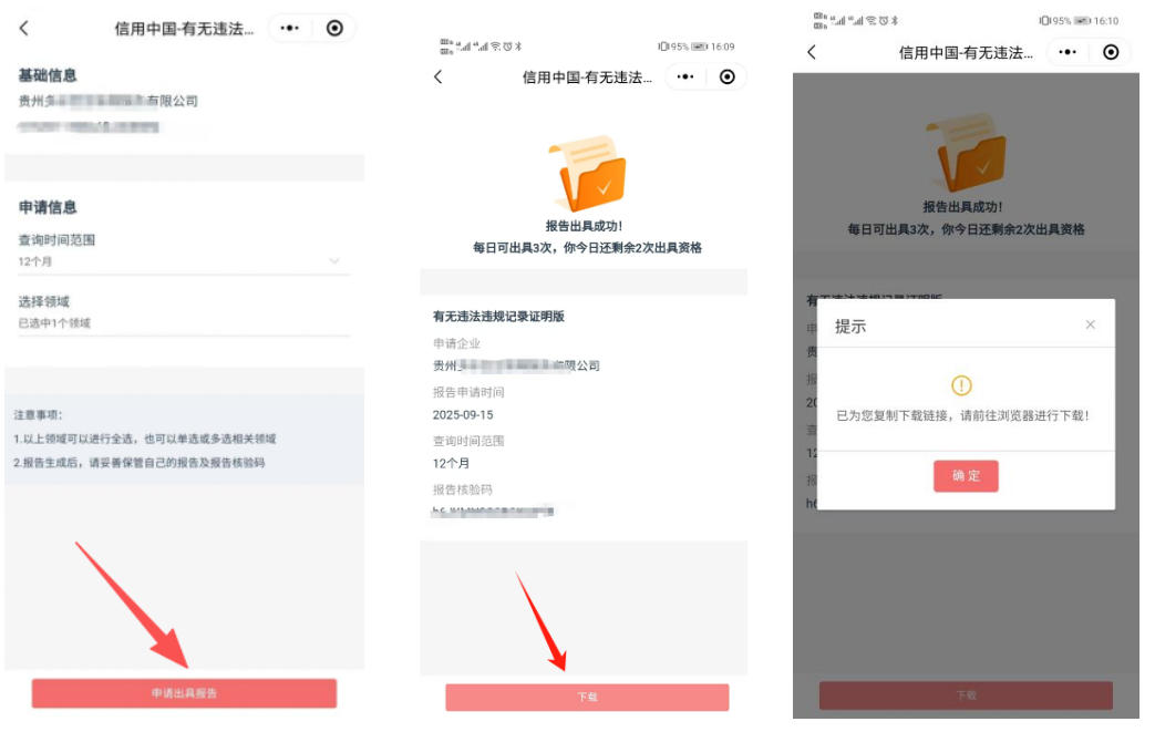 选择“申请出具报告”,点击“下载”,页面会弹框提示已复制链接(图23),点击“确定”后,打开手机浏览器,粘贴链接后再次点击“下载”即可保存电子版专项信用报告(图24)。